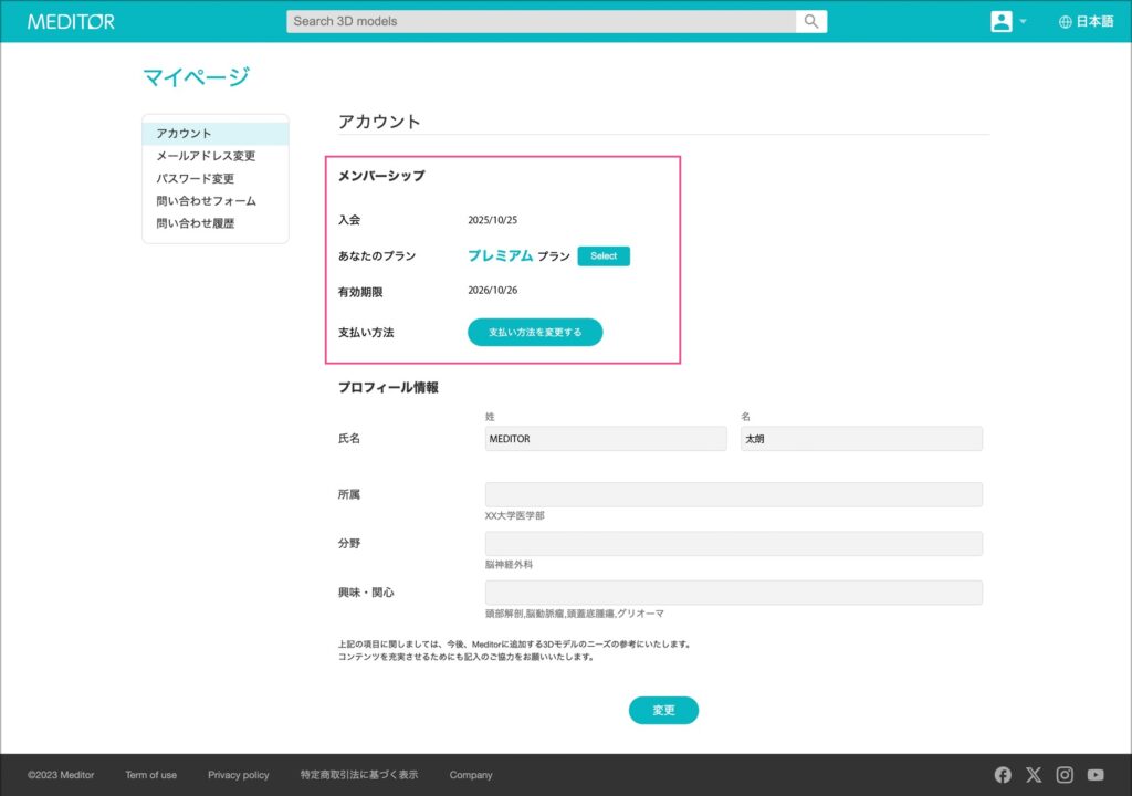 - MEDITOR®︎の有料プランにご契約いただいた方でお支払い方法の変更を希望される場合は、「お支払い方法を変更する」をクリックすることで、サブスクリプションのお支払いに使用するクレジットカードの変更が可能です。お支払い方法の変更に関する詳細については、こちらをご確認ください。