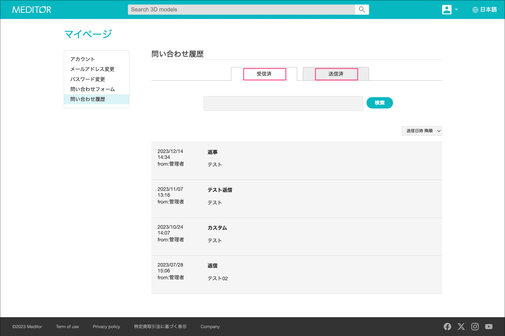 TOP » アカウント » 問い合わせについて » お問い合わせの返信について アカウント アカウントの作成 マイページの構成 アカウントの編集 メール・パスワードの変更 問い合わせについて アカウント削除 プラン/価格 プランについて 教育目的でのご使用について 事業者のご使用について 契約・請求について 限定プランのご使用について 利用規約 利用規約 プライバシーポリシー 特定商取引法に基づく表示 使用上のご注意 推奨環境 バグ・問題報告 アカウント お問い合わせの返信について 管理者からの返信もこちらの「お問い合わせ履歴」に届きます。 「受信済み」と「送信済み」タブに分かれています。お探しのメッセージが見当たらない場合は両方のタブをご確認ください。 各メッセージをクリックすると、各件のメッセージ履歴が表示されます。返信をご希望の場合は画面下部に「返信を追加する」ボックス内にメッセージを記載の上、送信してください。