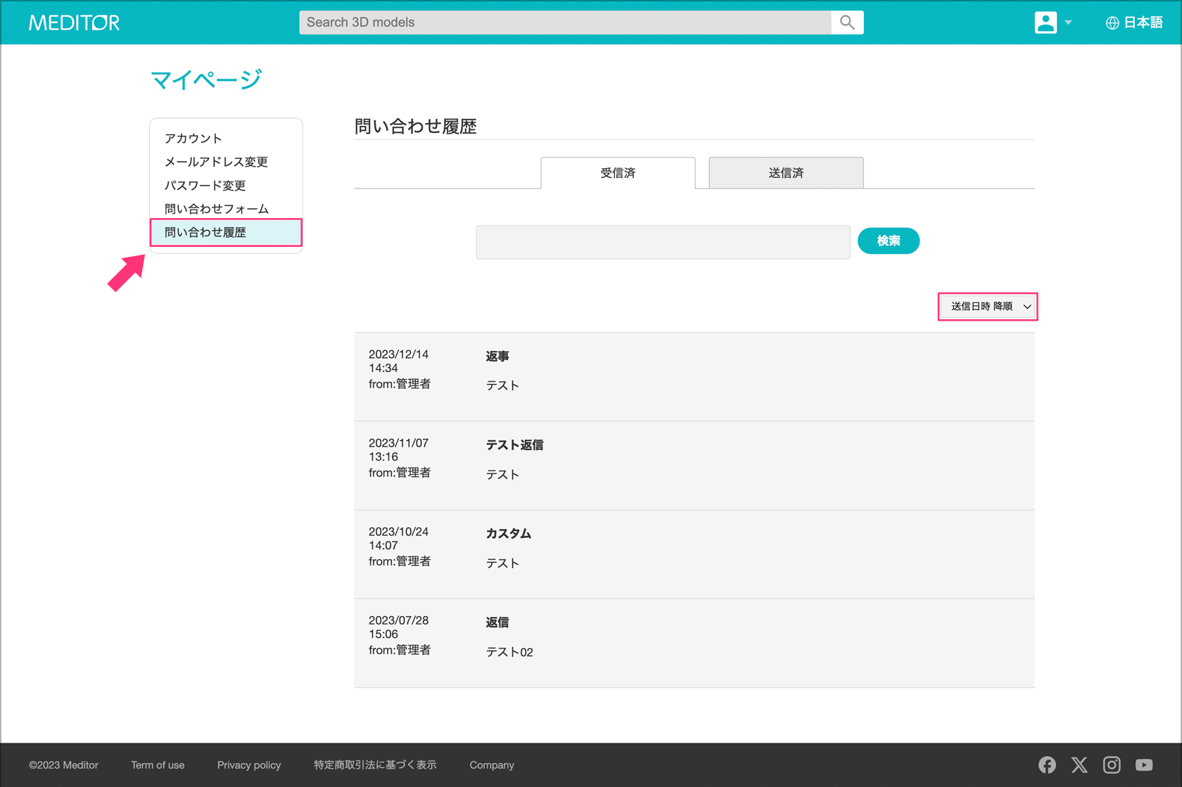 TOP » アカウント » 問い合わせについて » 問い合わせ履歴 アカウント アカウントの作成 マイページの構成 アカウントの編集 メール・パスワードの変更 問い合わせについて アカウント削除 プラン/価格 プランについて 教育目的でのご使用について 事業者のご使用について 契約・請求について 限定プランのご使用について 利用規約 利用規約 プライバシーポリシー 特定商取引法に基づく表示 使用上のご注意 推奨環境 バグ・問題報告 アカウント 問い合わせ履歴 問い合わせやオーダー内容の控えなどはこちらから確認できます。 MEDITORへログイン後、ページ右上の「プロフィールボタン」→「マイページ」をクリック後に、マイページ左側の「問い合わせ履歴」をクリックすることにより問い合わせ履歴へアクセスできます。 お問い合わせフォームは、ProプランおよびPremiumプランのお客様のみご利用可能です。Freeプランのお客様はご利用になれません。 「送信日」や「件名」の「昇順」と「降順」によって並び替えが可能です。