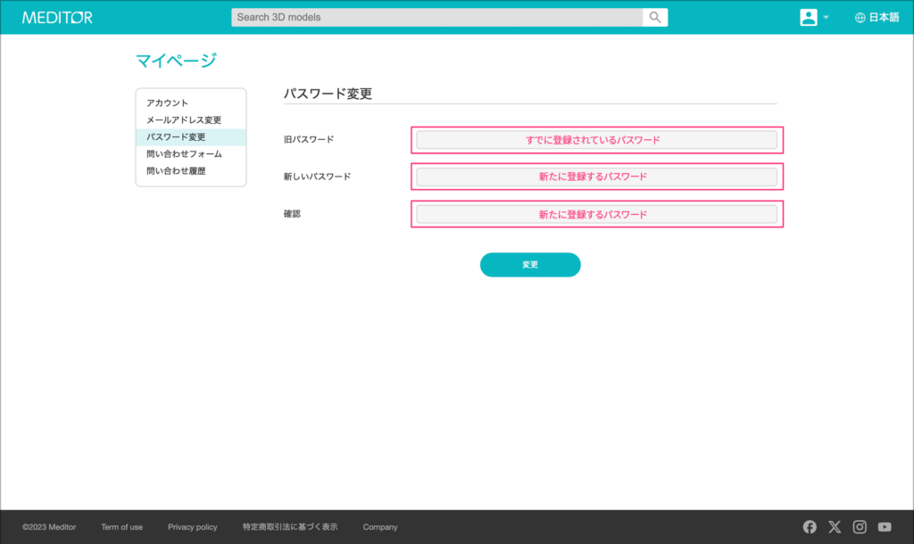 TOP » アカウント » メール・パスワードの変更 » パスワード変更 アカウント アカウントの作成 マイページの構成 アカウントの編集 メール・パスワードの変更 問い合わせについて アカウント削除 プラン/価格 プランについて 教育目的でのご使用について 事業者のご使用について 契約・請求について 限定プランのご使用について 利用規約 利用規約 プライバシーポリシー 特定商取引法に基づく表示 使用上のご注意 推奨環境 バグ・問題報告 アカウント パスワード変更 パスワード変更 ご登録のパスワードの変更が行えます。パスワードの変更にはすでに登録されているパスワードと新たに登録するパスワード、また確認用に再度新たなパスワードの入力が必要となります。最後に「変更」ボタンを押して完了です。