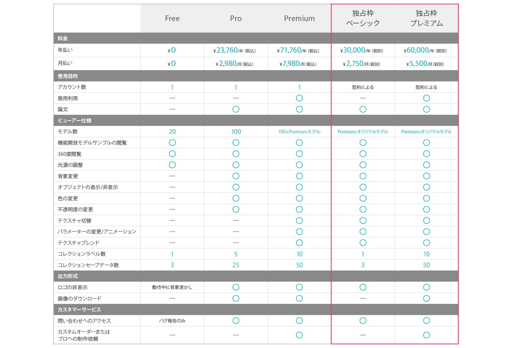 - 限定プランは、限定モデルの制作費を初期費用の他に、環境構築の年間の運用費がかかります。運用費は会員の人数、ご使用になる機能、閲覧できるモデルの種類、ユーザーが費用を支払って使うサービスかによって変動します。改めて、見積いたしますのでお気軽にお問い合わせください。