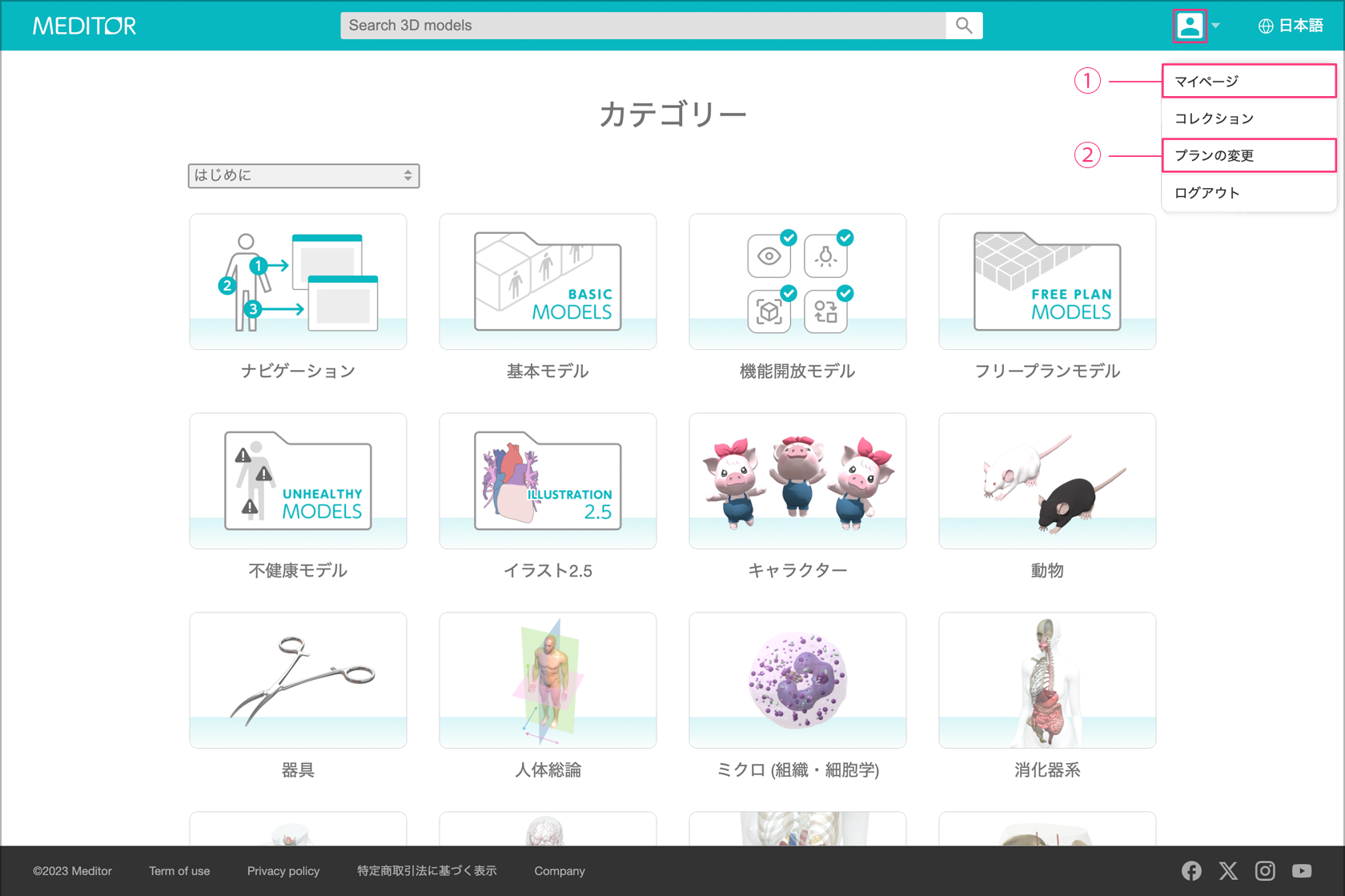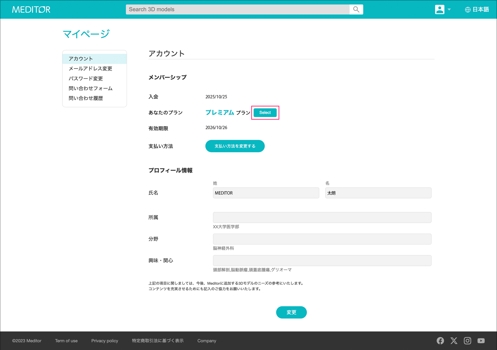 ①メニューから「プラン変更」を選択。またはメニューから「マイページ」を選択してください。次にアカウントの「あなたのプラン」から「Select」を 選択してください。