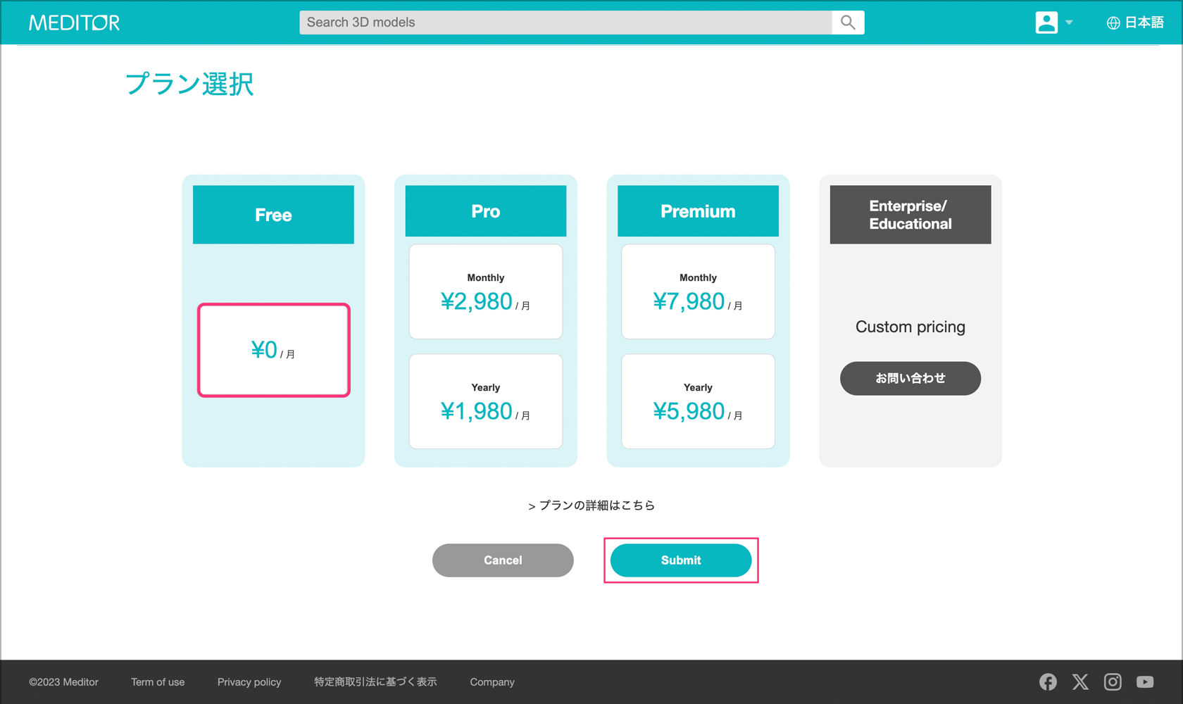 ②Freeプランの「¥0 /月」を選択し、「Submit」をクリックしてください。