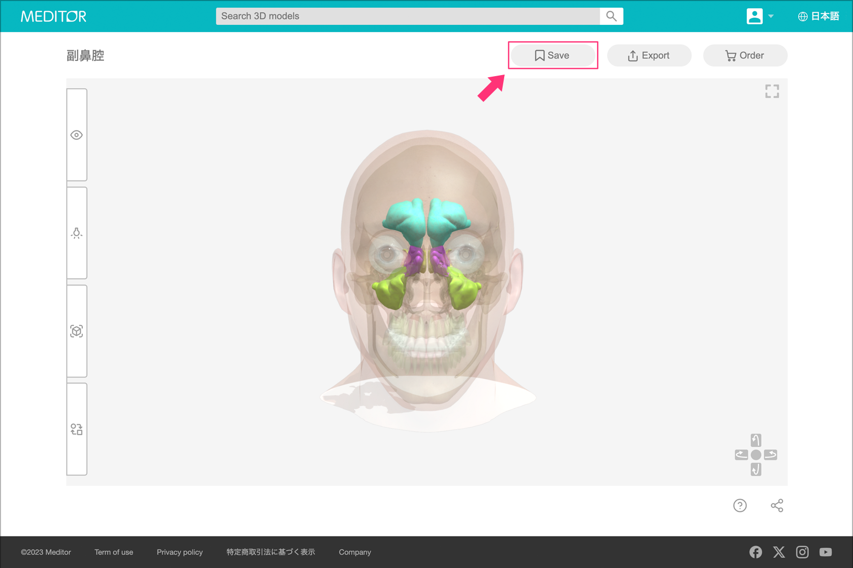 TOP » MEDITOR® チュートリアル » エクスポート、オーダー » モデルの保存について » どこからモデルを保存できる? MEDITOR® チュートリアル MEDITOR®とは MEDITOR®の画面構成 モデルの分類 モデルの検索 基本操作 エクスポートについて カスタムオーダーについて モデルの保存について Viewタブ Lightingタブ Objectタブ Transformタブ 3Dモデルコントローラー フルスクリーンについて ヘルプについて 共有について MEDITOR® チュートリアル このページが含まれる項目:モデルの保存について どこからモデルを保存できる? ビューアー右上の「Save」ボタンを押すと、現在のモデルの状態がコレクションとして保存されます。