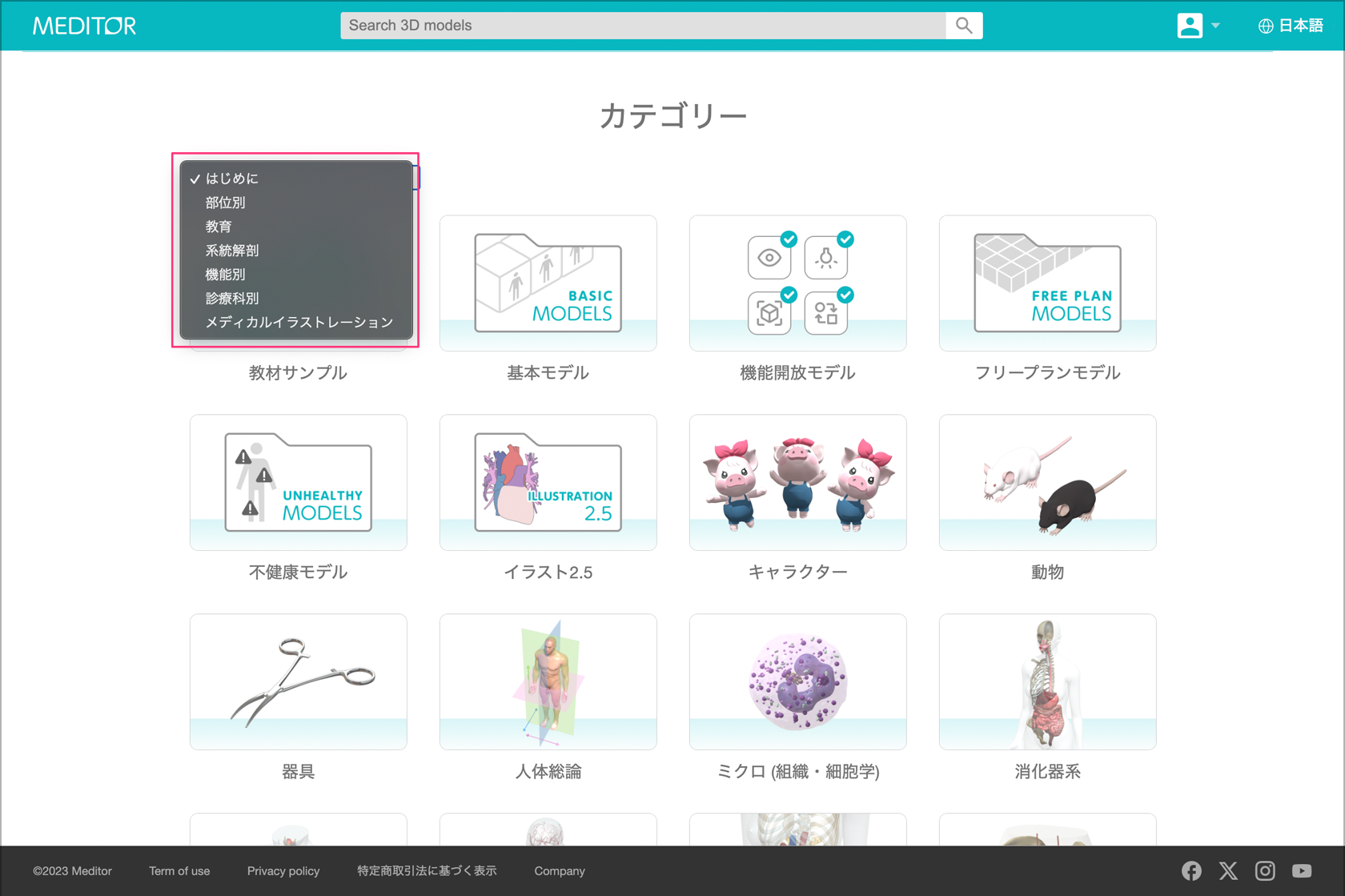 ※複数のカテゴリーに該当するモデルの場合、どのカテゴリーでも表示されます。例えば、「小腸」のモデルを閲覧したい場合、部位別検索の「腹部」カテゴリーに表示され、系統解剖検索の「消化器系」カテゴリーでも表示されます。