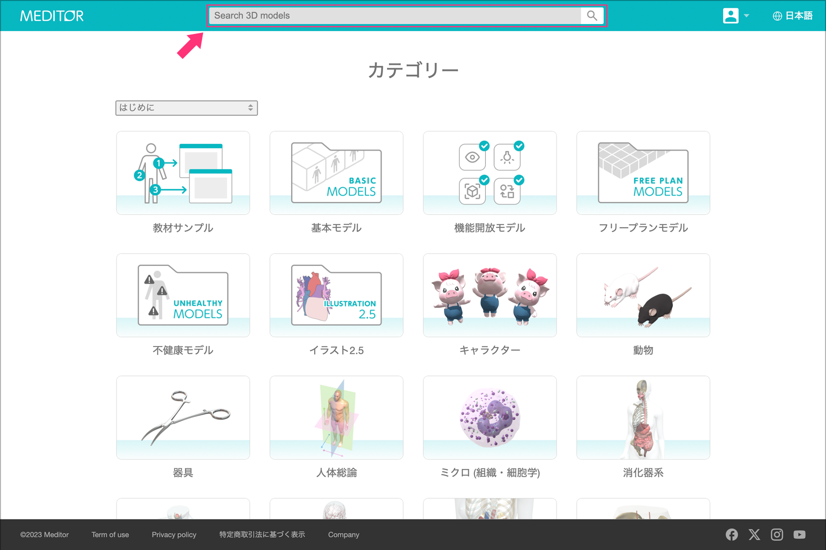 画面上部のヘッダーエリアにある「モデル検索ウィンドウ」からキーワード検索をすることができます。