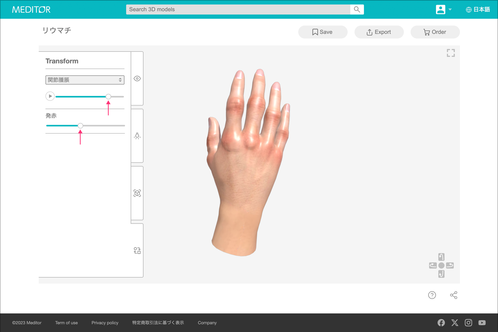 テクスチャブレンドはシェイプアニメーション(※1)に合わせて調節することもできます。アニメーションとテクスチャブレンドを組み合わせた機能をパラメーターと言い、浮腫や炎症などの程度を調整する機能として利用できます。